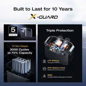 - [Durable and Reliable for 10 Years] Built with LiFePO4 (LFP) cells, offering 3000 cycles to 70%. The IP54 battery pack ensures triple protection: LFP cells, IP54 enclosure, and Battery Management System (BMS).