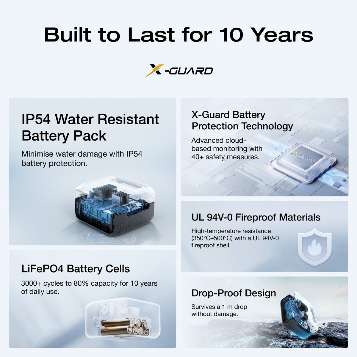 Durable & portable: LiFePO4 battery (3000 cycles), IP54 protection, rugged shell; compact and lightweight with smart app control.
