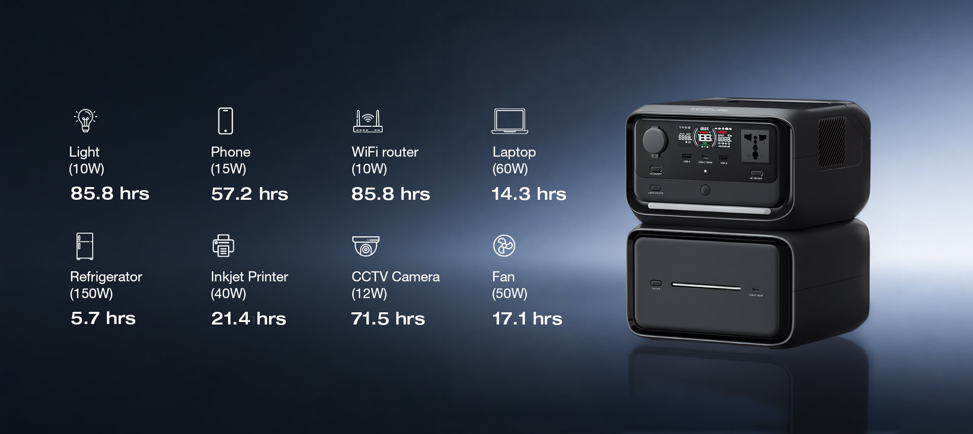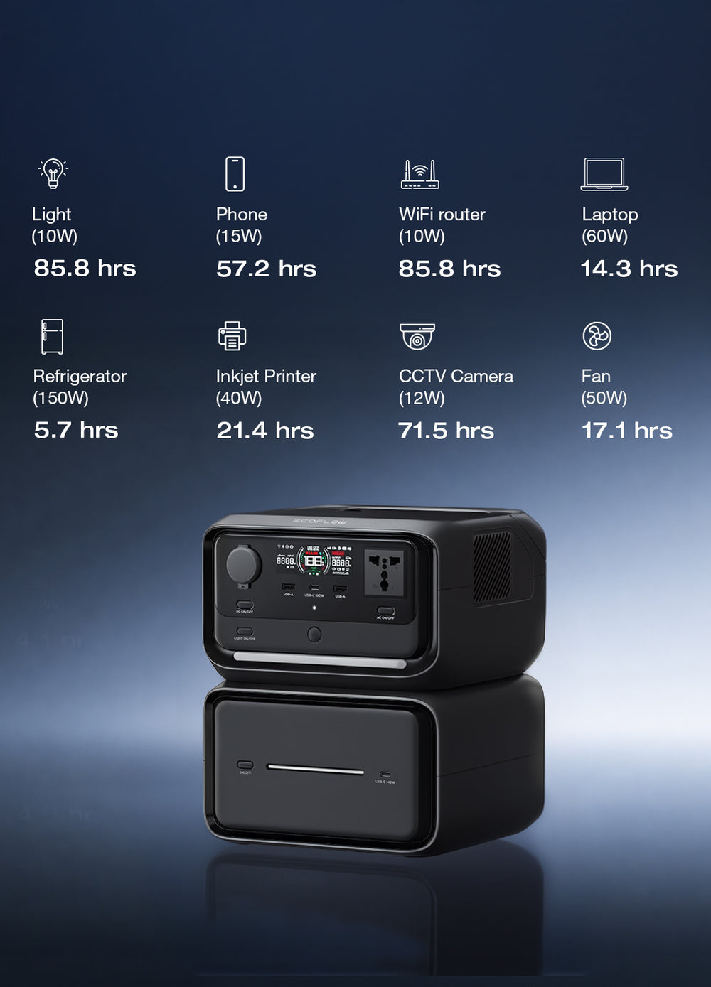 Expandable capacity: Stack with EB600 battery up to 858Wh via wireless Pogo Pin; adds 140W USB-C.