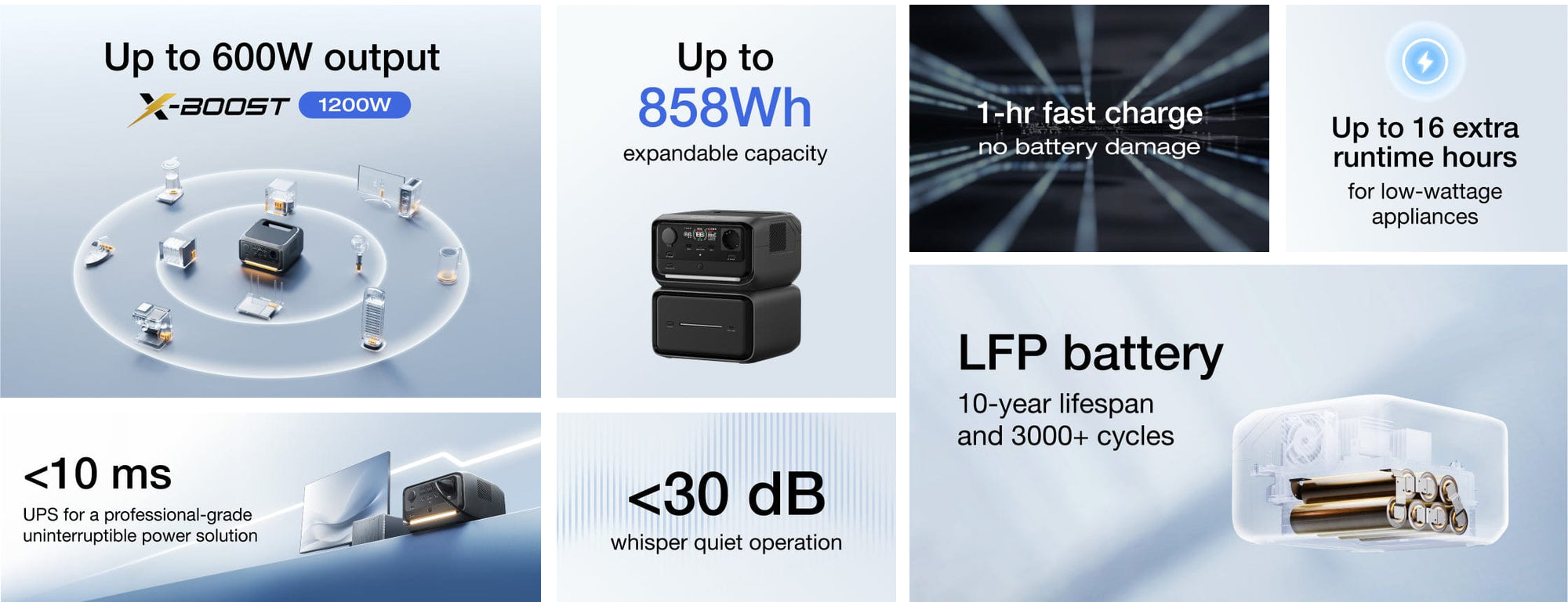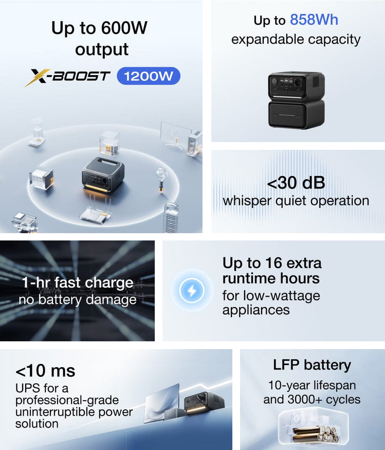 Strong power output: 600W rated (1200W with X-Boost), 7+1 outlets powering 90% of home devices; built-in light.