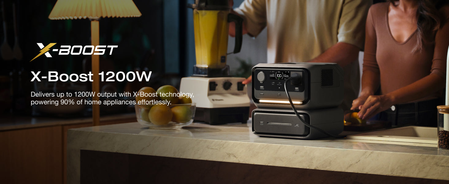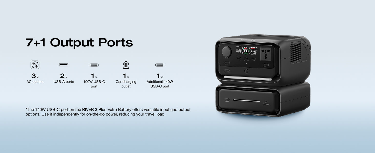 - [High Power up to 1200W]: RIVER 3 Max powers appliances up to 1200W with X-Boost and provides 600W steady output. It features 7+1 outlets—3 UPS AC, 2 USB-A, USB-C, and car output—powering 90% of home devices. An extra battery adds a 140W USB-C port for more input/output options. A built-in light ensures visibility anytime.