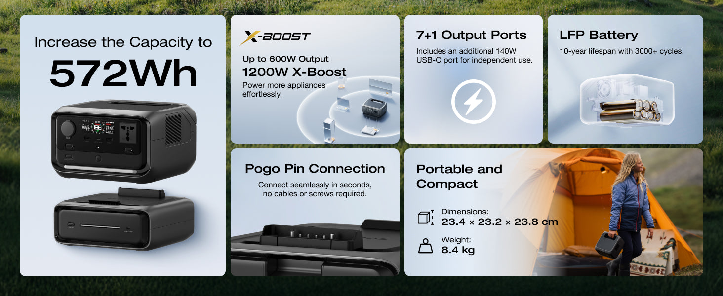 - [Modular Design, Easy to Use]: Expand capacity up to 572Wh with extra battery EB300(286Wh). Pogo Pin technology ensures seamless, wireless attachment. An extra battery adds a 140W USB-C port for more input/output options.