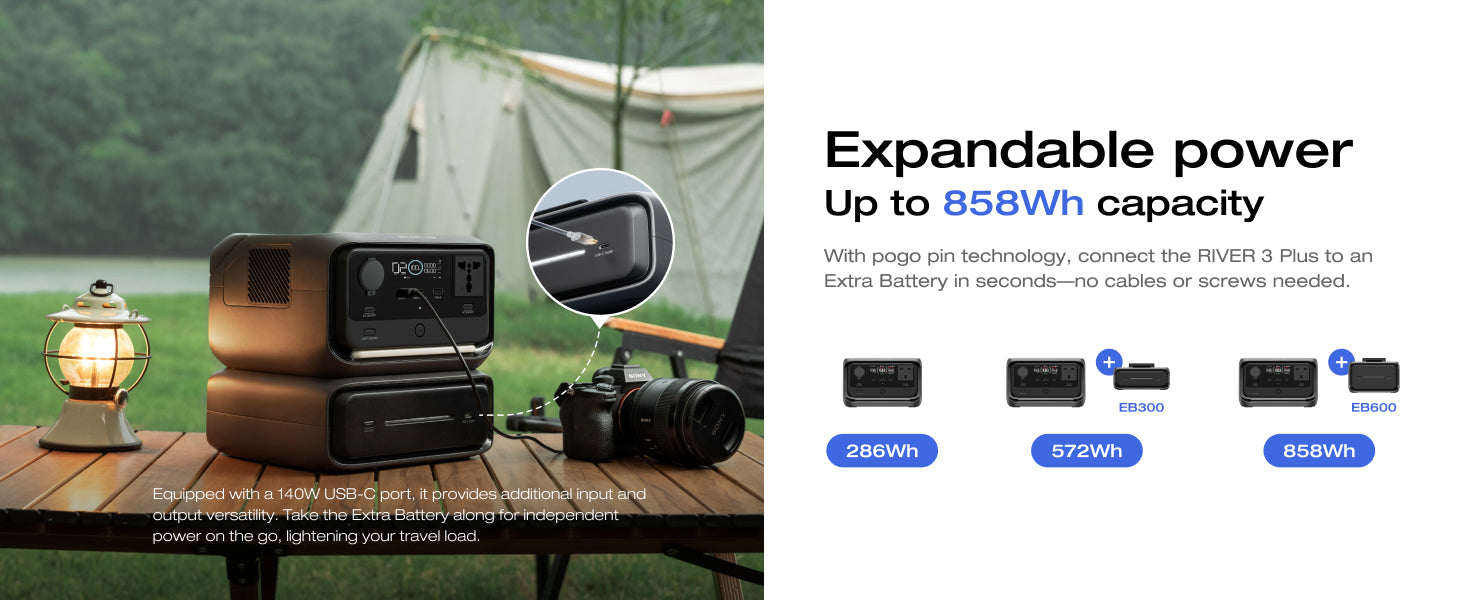 - [Expandable Power, Easy to Use]: Expand capacity up to 858Wh with EB300 (286Wh) or EB600 (572Wh). Pogo Pin technology ensures seamless, wireless attachment. An extra battery adds a 140W USB-C port for more input/output options.