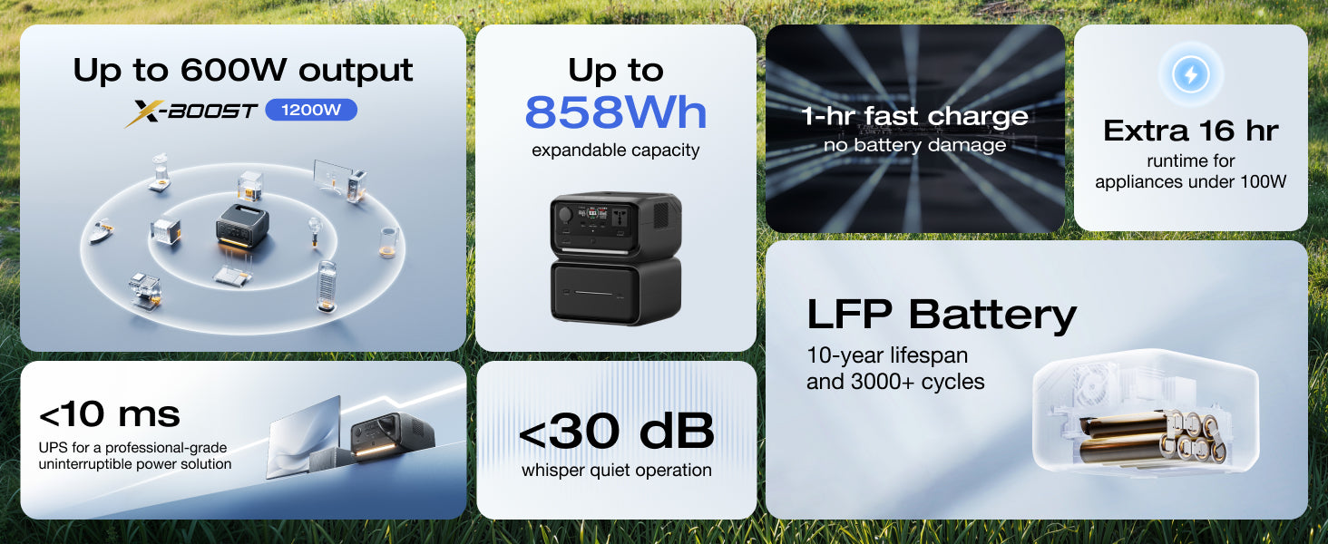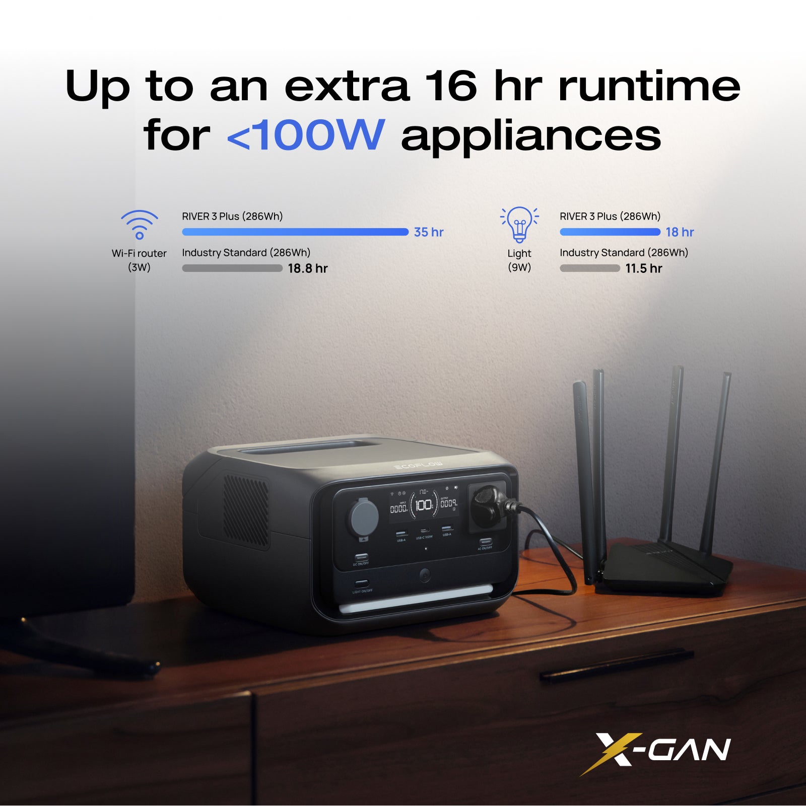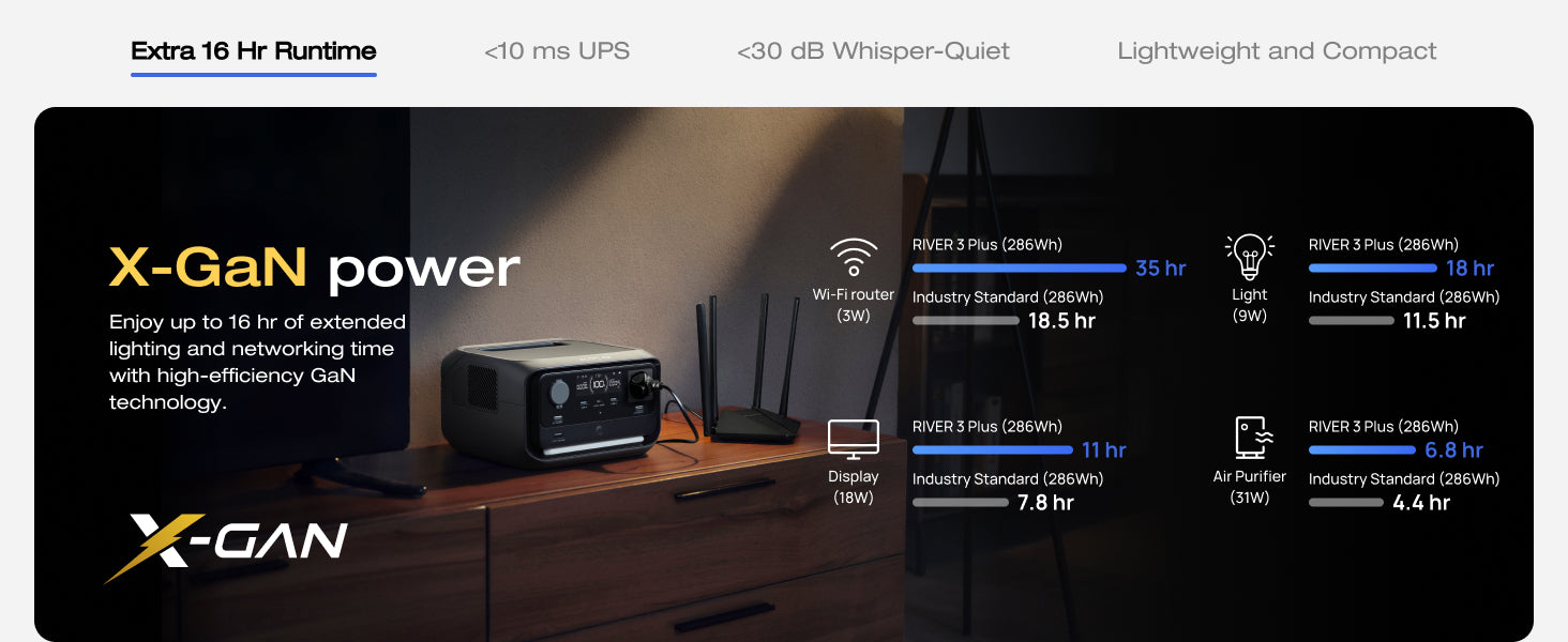- [Extra 16 hr Runtime & Ultra-Quiet]: X-GaNPower boosts efficiency, delivering 16 hr runtime for <100W devices like lights and routers. Compact and ultra-quiet at 30 dB, it runs silently even at 0.5 m away.