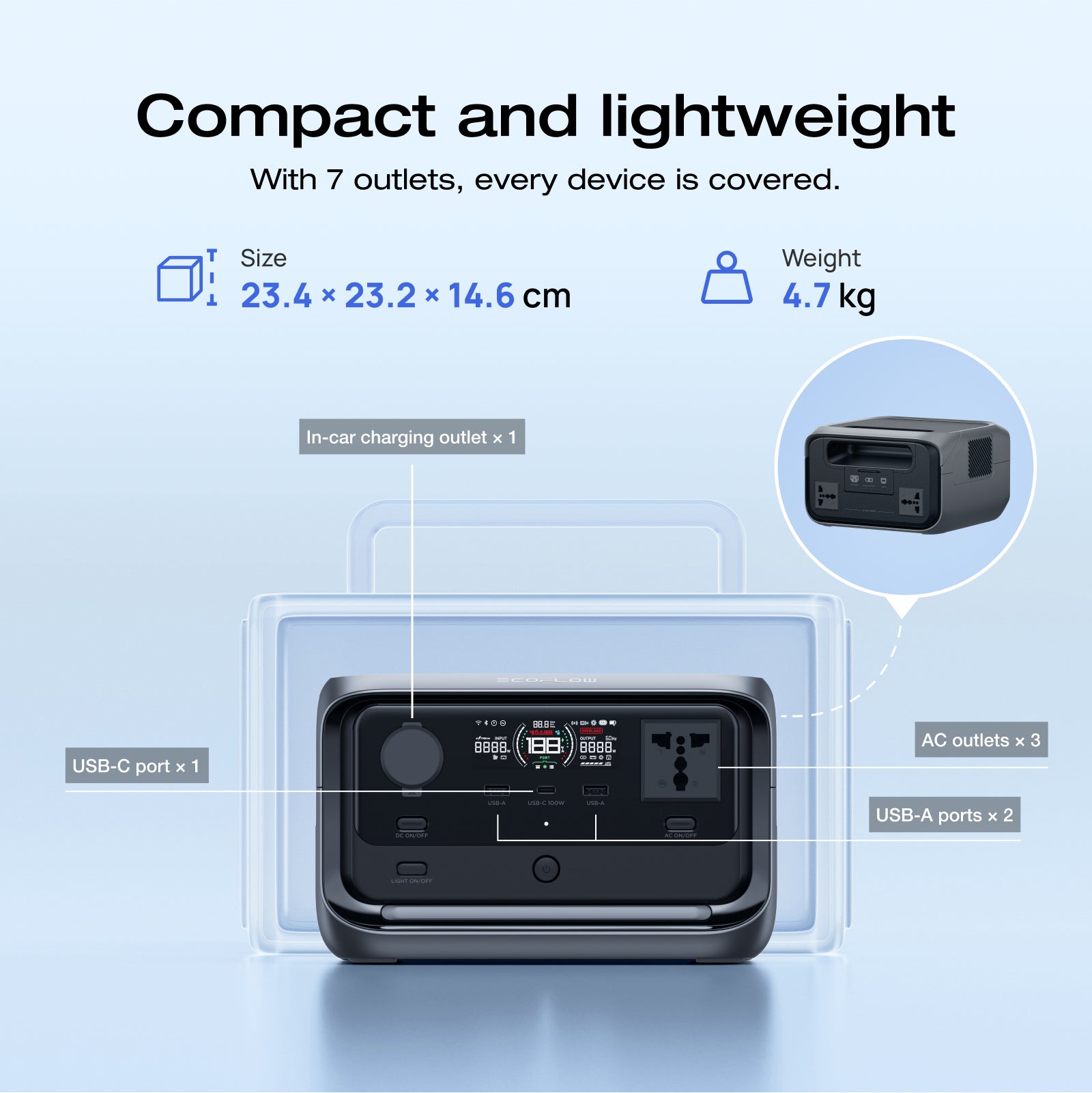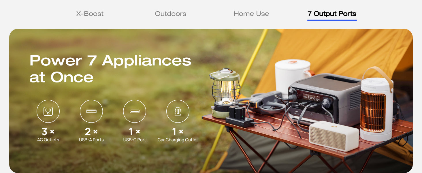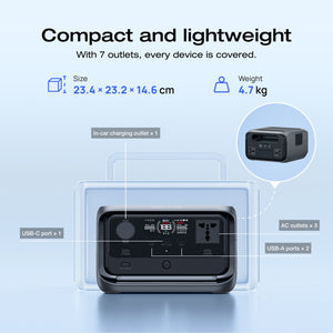 - [High Power up to 1200W]: RIVER 3 Plus powers appliances up to 1200W with X-Boost and provides 600W steady output. It features 7 outlets—3 UPS AC, 2 USB-A, USB-C, and car output—powering 90% of home devices. A built-in light ensures visibility anytime.